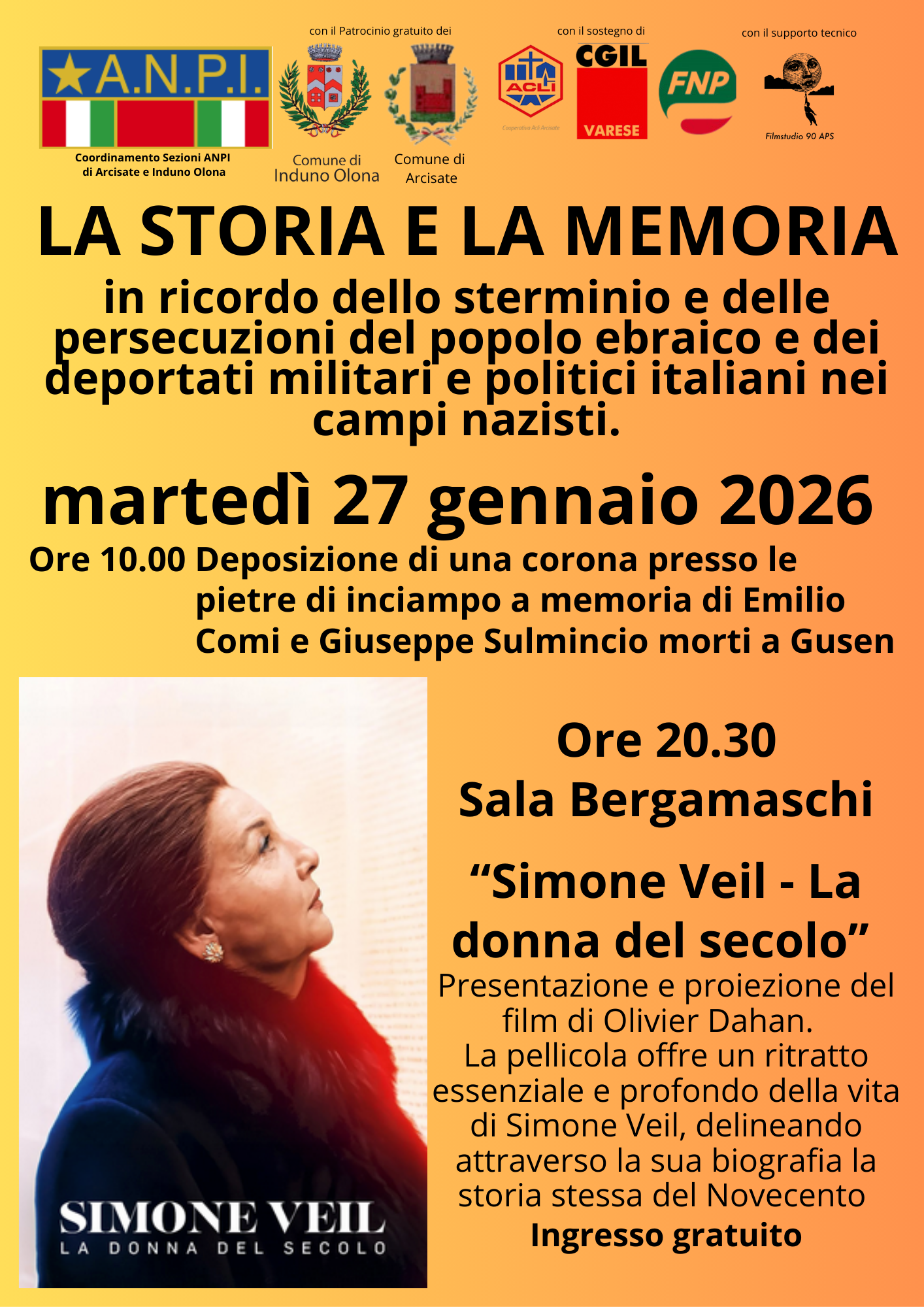 - ore 20.30 Sala Bergamaschi “Simone Veil - La Donna del Secolo”: presentazione e proiezione del film di Olivier Dahan. La pellicola offre un ritratto essenziale e profondo della vita di Simone Veil, delineando attraverso la sua biografia la storia stessa del novecento