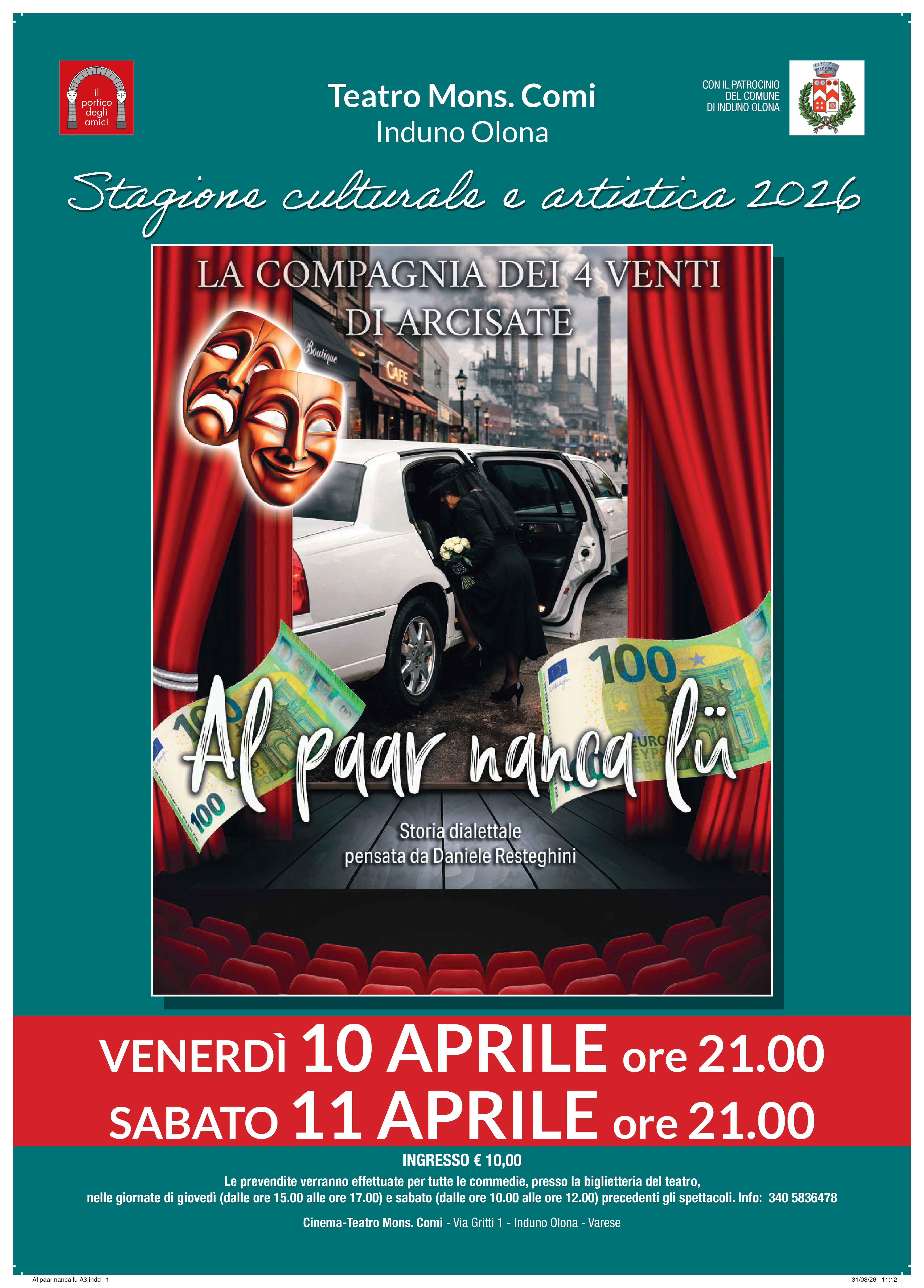 Ingresso Euro 10,00 - Le prevendite verranno effettuate per tutte le commedie, presso la biglietteria del teatro,