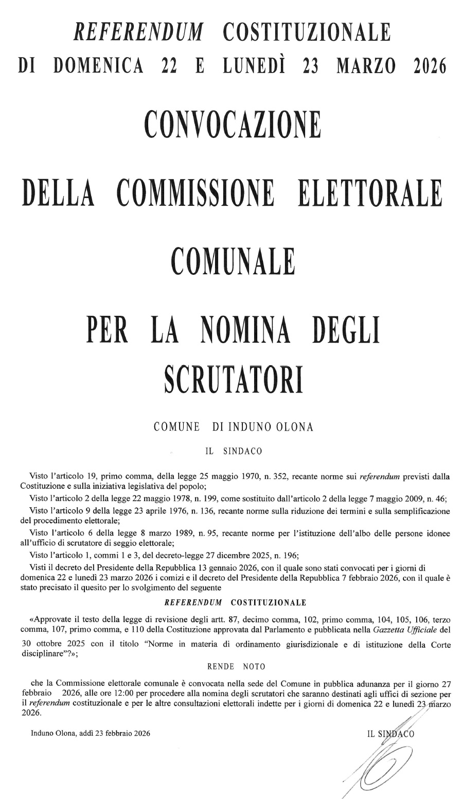 Rende notoche la Commissione elettorale comunale è convocata nella sede del Comune in pubblica adunanza per il giorno 27 febbraio 2026, alle ore 12:00 per procedere alla nomina degli scrutatori che saranno destinati agli uffici di sezione per il referendum costituzionale e per le altre consultazioni elettorali indette per i giorni di domenica 22 e lunedì 23 marzo 2026.
