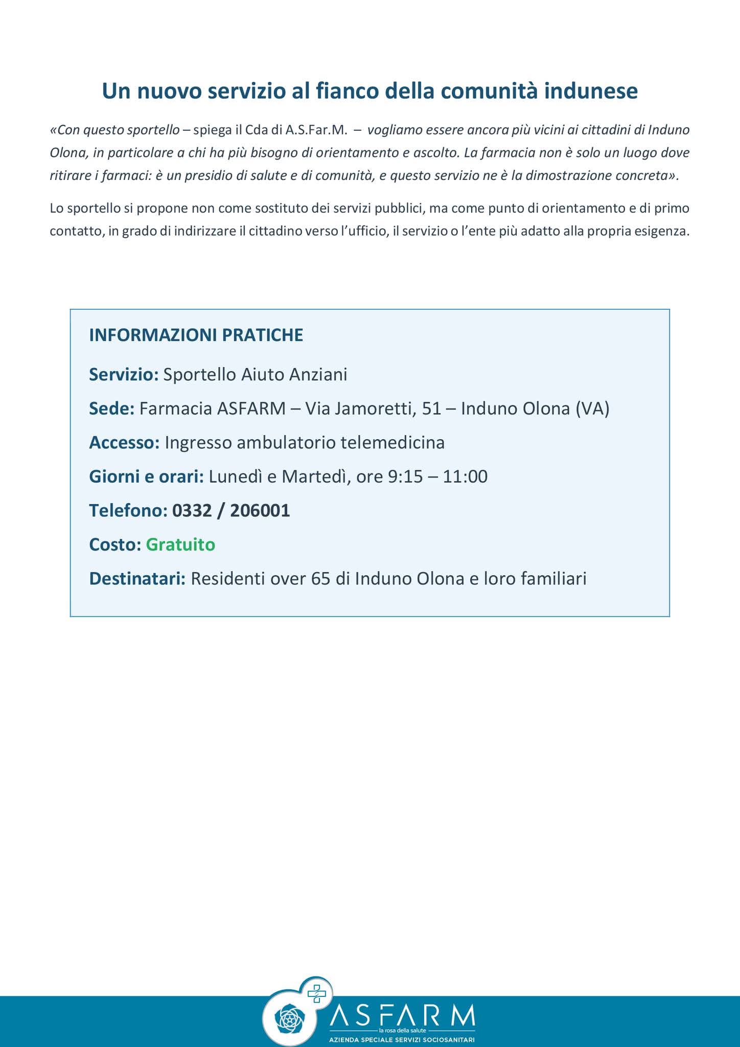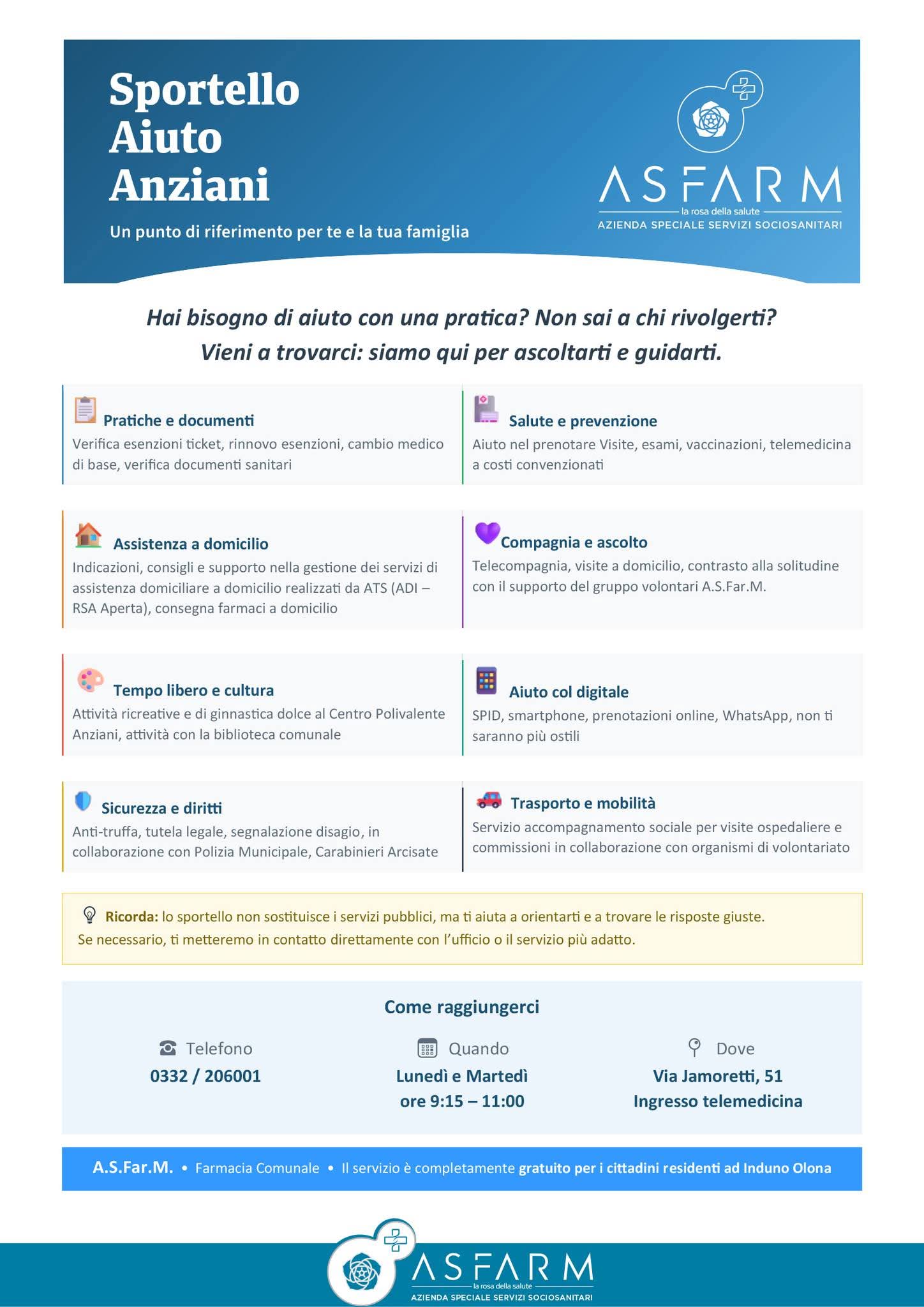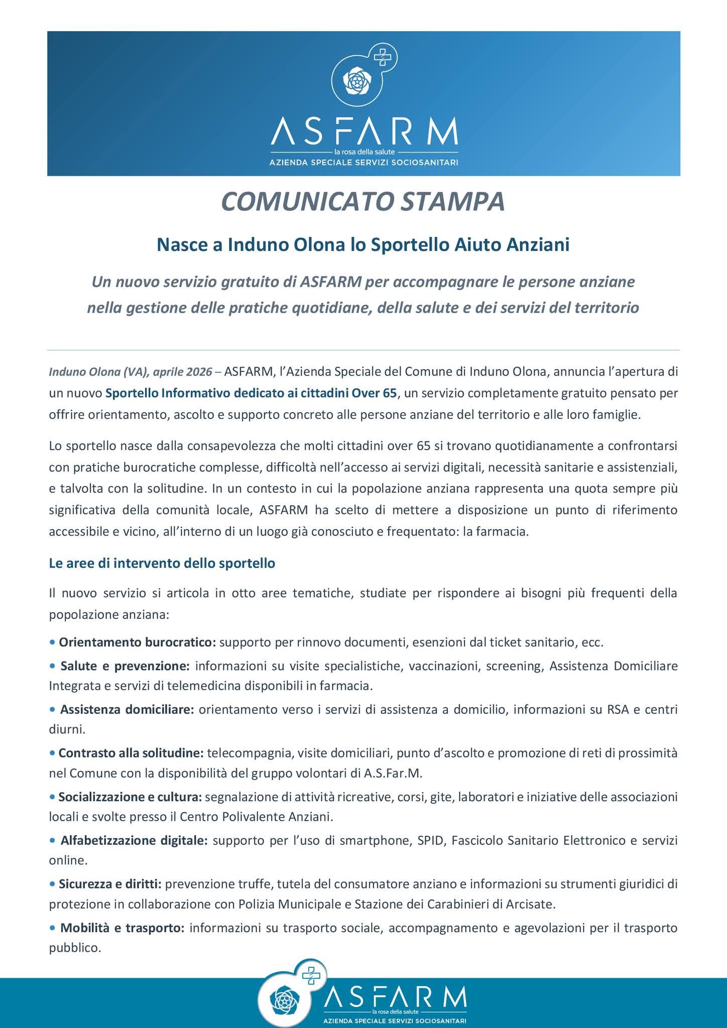 Un nuovo servizio gratuito di ASFARM per accompagnare le persone anziane nella gestione delle pratiche quotidiane, della salute e dei servizi del territorio Induno Olona (VA), aprile 2026-ASFARM, l'Azienda Speciale del Comune di Induno Olona, annuncia l'apertura di un nuovo Sportello Informativo dedicato ai cittadini Over 65, un servizio completamente gratuito pensato per offrire orientamento, ascolto e supporto concreto alle persone anziane del territorio e alle loro famiglie.